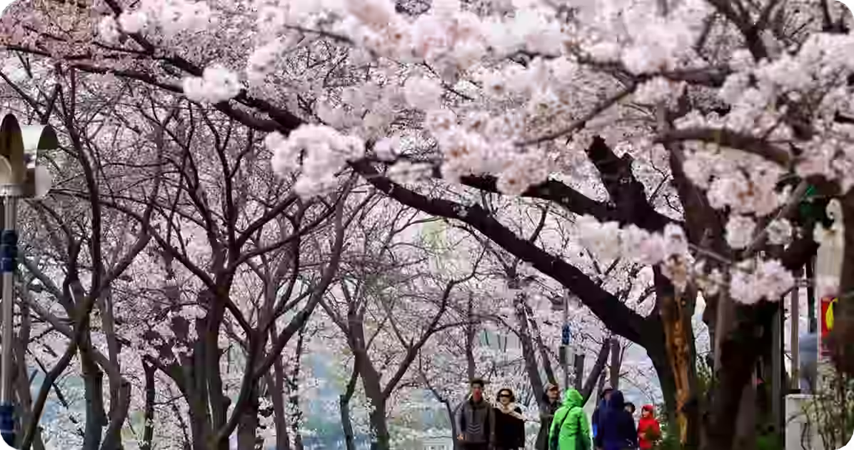 Seokchon Lake Stroll: Walk through the lakeside area colored in light pink blossoms