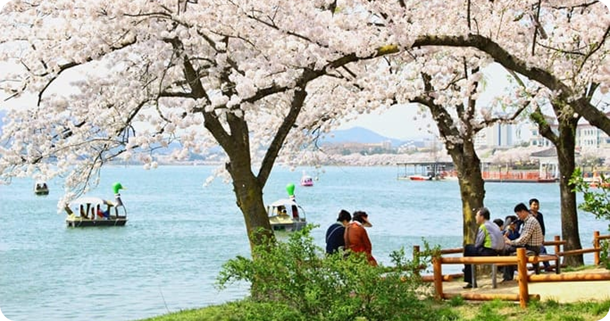 * Bomun Lake in Gyeongju, a historic city in the southern part of Korea, shows off its best every April when 9,000 cherry trees around the lake burst into bloom. Bomun Lake is located at the center of Bomun Tourist Complex, a tourist district where you can find hotels, resorts, theme parks, an amusement park, and other various attractions.